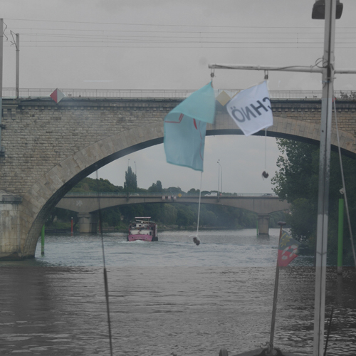 We travelled the Marne River and its canal upstream where we had quite rainy weather. To be able to undergo the very low bridges of the Canal entre Champagne et Bourgogne we had to put down the top tent and steer under open sky for some days. The canal is very narrow and in some parts very muddy which only allows low speed and makes steering quite hard. Additionally there are up to twenty locks to pass every day … so we where quite happy to be back on the rivers on the Saône which brought us to Lyon.